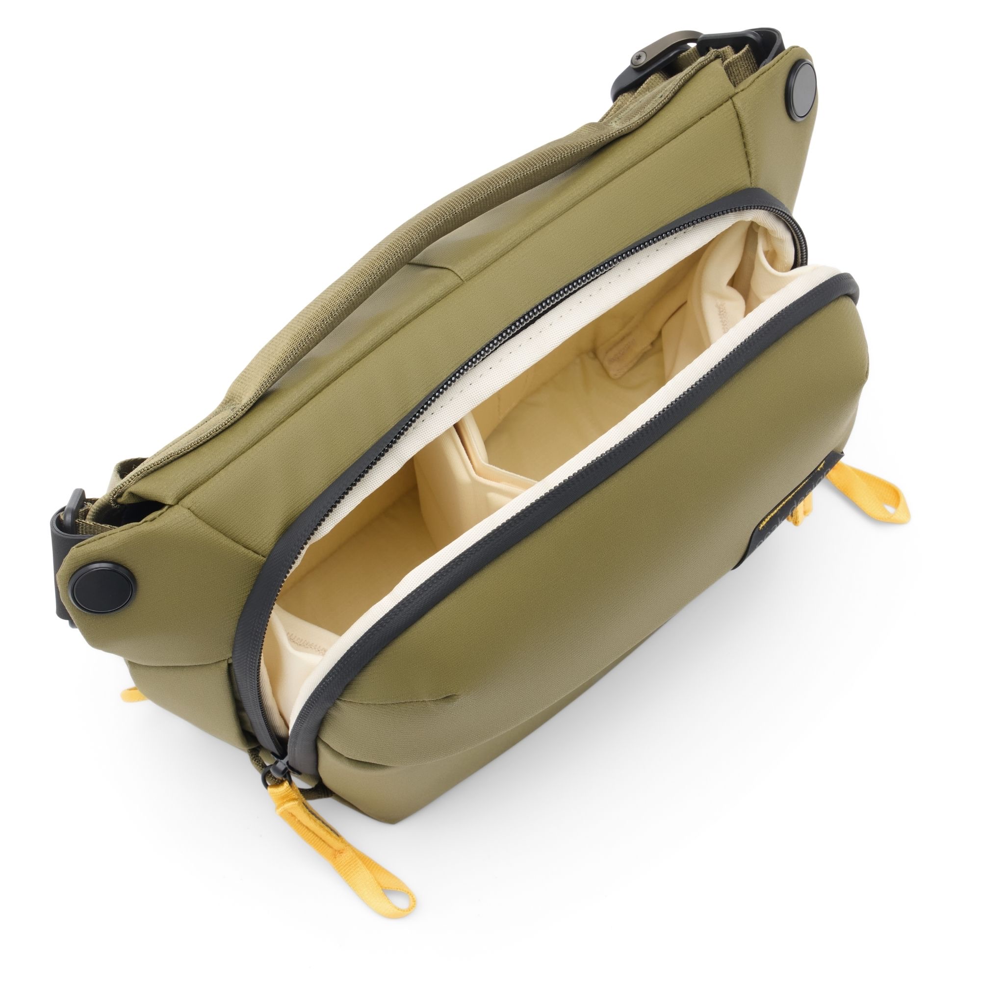 Das innovative FlexFold-System ist ein Markenzeichen von Peak Design und ermöglicht eine besonders flexible Innenaufteilung. Der Einteiler besteht aus zwei Lagen Stoff, die unabhängig voneinander gefaltet oder ausgeklappt werden können – so entsteht ein „Regal“-Effekt mit Zwischenboden. Diese clevere Konstruktion schützt deine Ausrüstung, hält Objektive sicher getrennt und macht die kompakte Sling Bag überraschend geräumig.